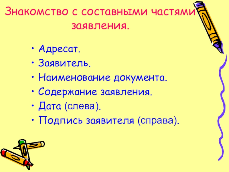 Слайд 6Знакомство с составными частями заявления.