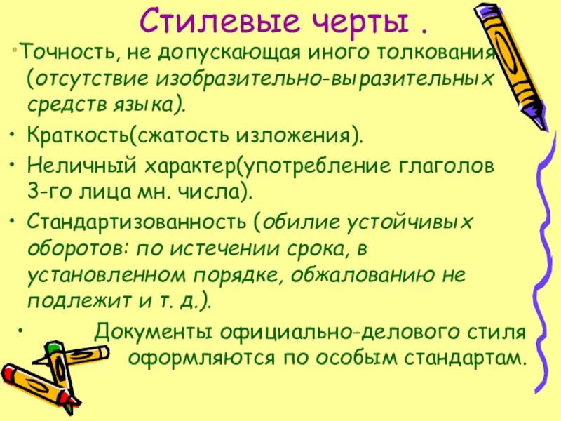 Стилевые черты .  Точность, не допускающая иного толкования (отсутствие изобразительно-выразительных средств языка).Краткость(сжатость изложения).Неличный характер(употребление глаголов