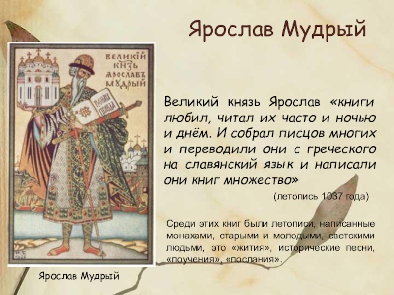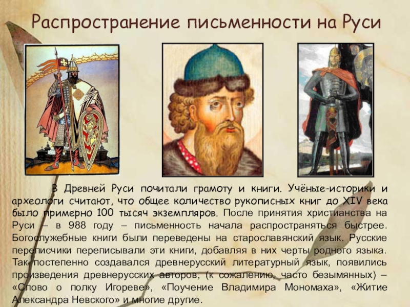 Среди этих книг были летописи, написанные монахами, старыми и молодыми, светскими людьми, это «жития», исторические песни, «поучения», «послания».