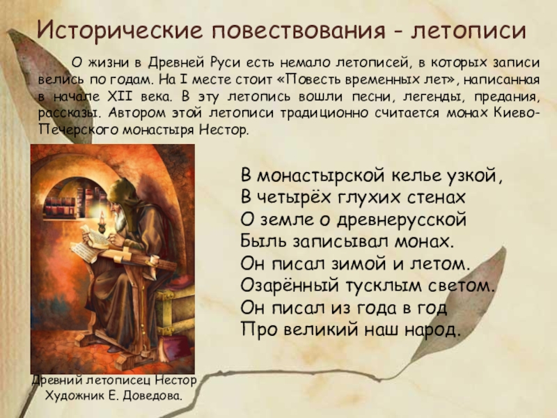О жизни в Древней Руси есть немало летописей, в которых записи велись по годам. На I месте стоит «Повесть временных лет», написанная в начале XII века. В эту летопись вошли песни, легенды, предания, рассказы. Автором этой летописи традиционно считается монах Киево-Печерского монастыря Нестор.