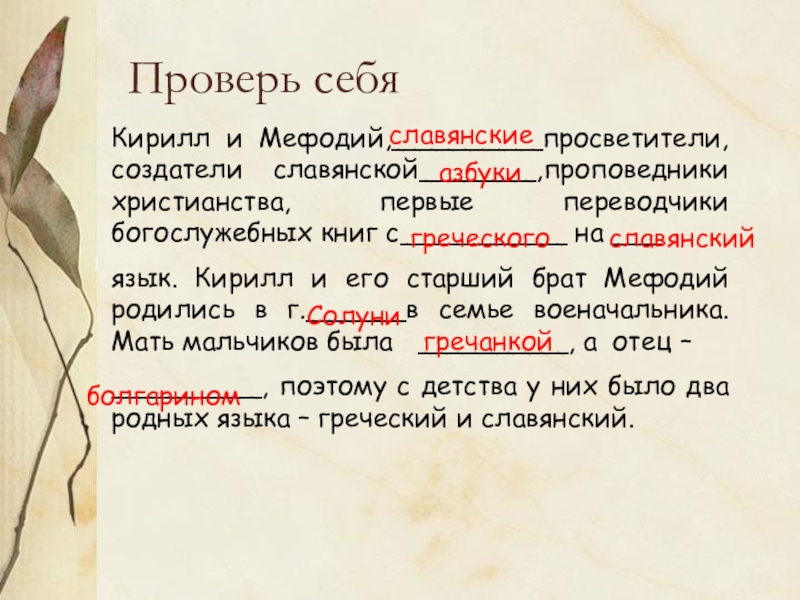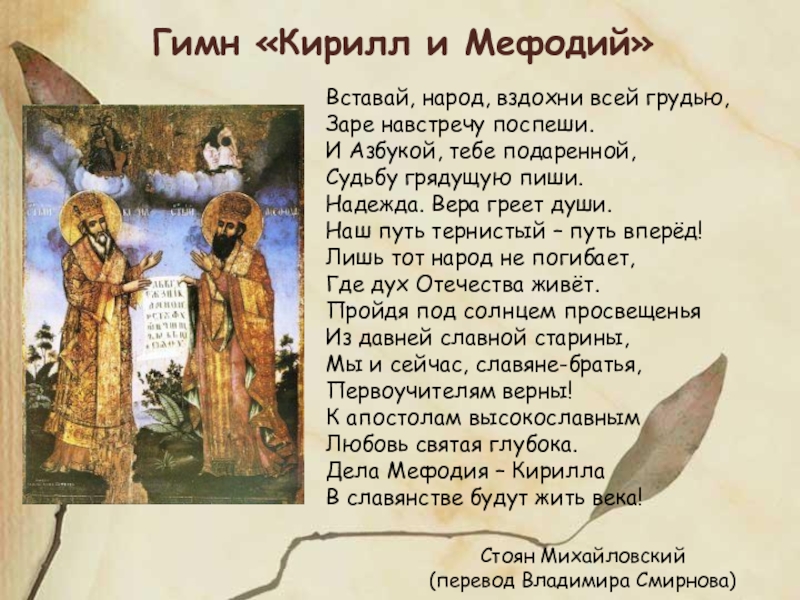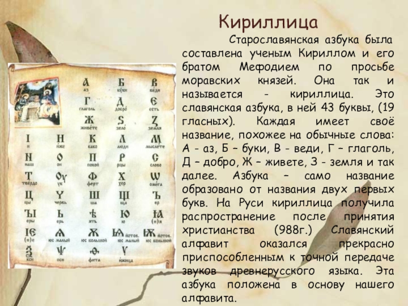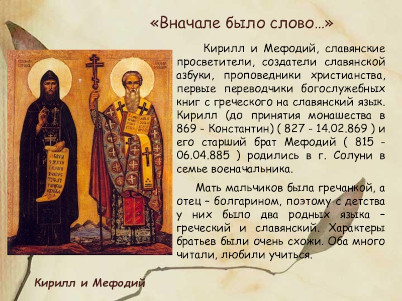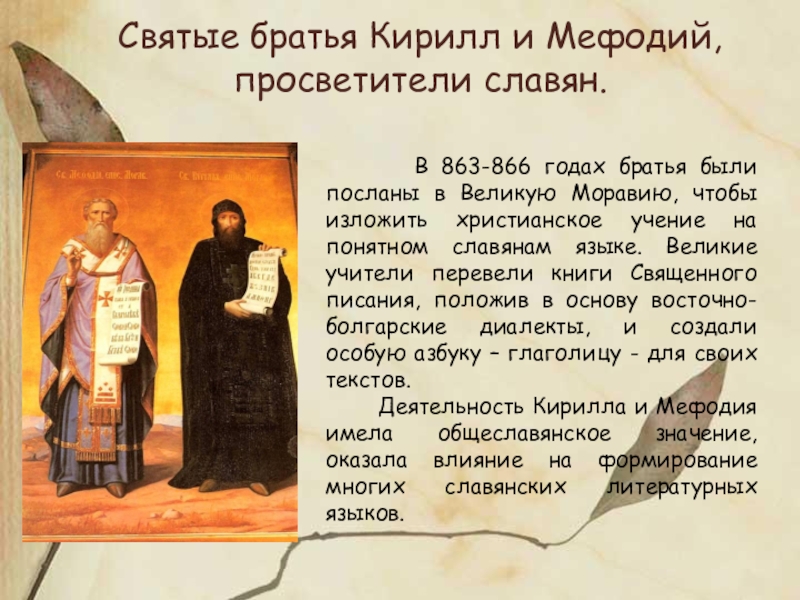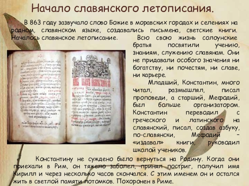 Младший, Константин, много читал, размышлял, писал проповеди, а старший, Мефодий, был больше организатором. Константин переводил с греческого и латинского на славянский, писал, создав азбуку, по-славянски, Мефодий – «издавал» книги, руководил школой учеников.