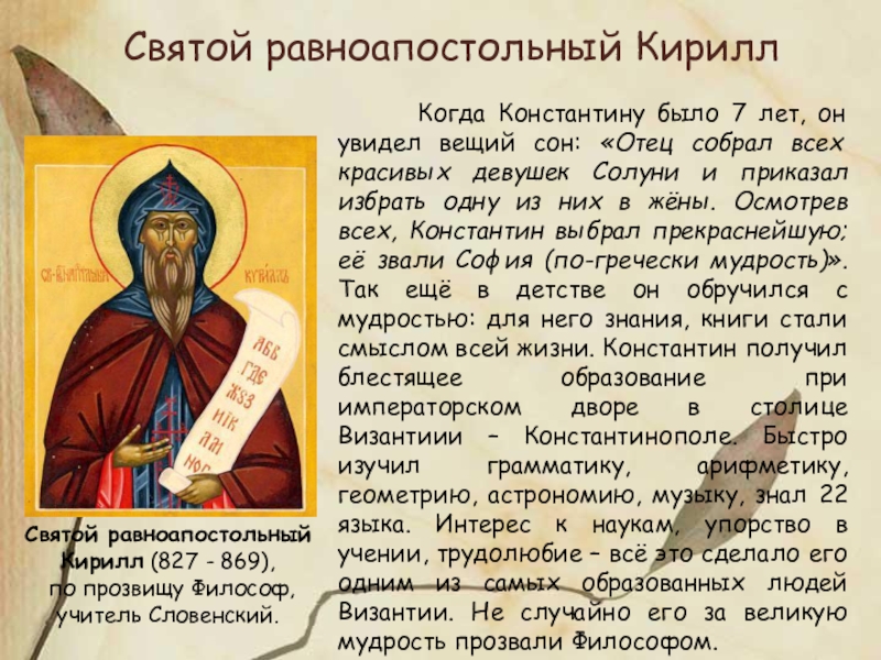 Когда Константину было 7 лет, он увидел вещий сон: «Отец собрал всех красивых девушек Солуни и приказал избрать одну из них в жёны. Осмотрев всех, Константин выбрал прекраснейшую; её звали София (по-гречески мудрость)». Так ещё в детстве он обручился с мудростью: для него знания, книги стали смыслом всей жизни. Константин получил блестящее образование при императорском дворе в столице Византиии – Константинополе. Быстро изучил грамматику, арифметику, геометрию, астрономию, музыку, знал 22 языка. Интерес к наукам, упорство в учении, трудолюбие – всё это сделало его одним из самых образованных людей Византии. Не случайно его за великую мудрость прозвали Философом.