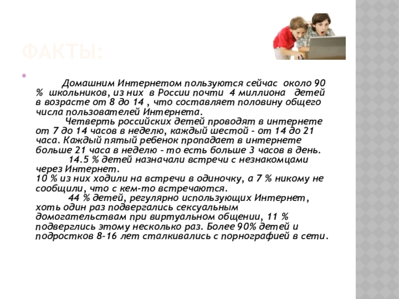 % школьников, из них в России почти 4 миллиона детей в возрасте от 8 до 14 , что составляет половину общего числа пользователей Интернета. Четверть российских детей проводят в интернете от 7 до 14 часов в неделю, каждый шестой – от 14 до 21 часа. Каждый пятый ребенок пропадает в интернете больше 21 часа в неделю – то есть больше 3 часов в день. 14.5 % детей назначали встречи с незнакомцами через Интернет. 10 % из них ходили на встречи в одиночку, а 7 % никому не сообщили, что с кем-то встречаются. 44 % детей, регулярно использующих Интернет, хоть один раз подвергались сексуальным домогательствам при виртуальном общении, 11 % подверглись этому несколько раз. Более 90% детей и подростков 8-16 лет сталкивались с порнографией в сети.
