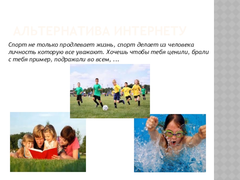 Альтернатива ИнтернетуСпорт не только продлевает жизнь, спорт делает из человека личность которую все уважают. Хочешь чтобы тебя