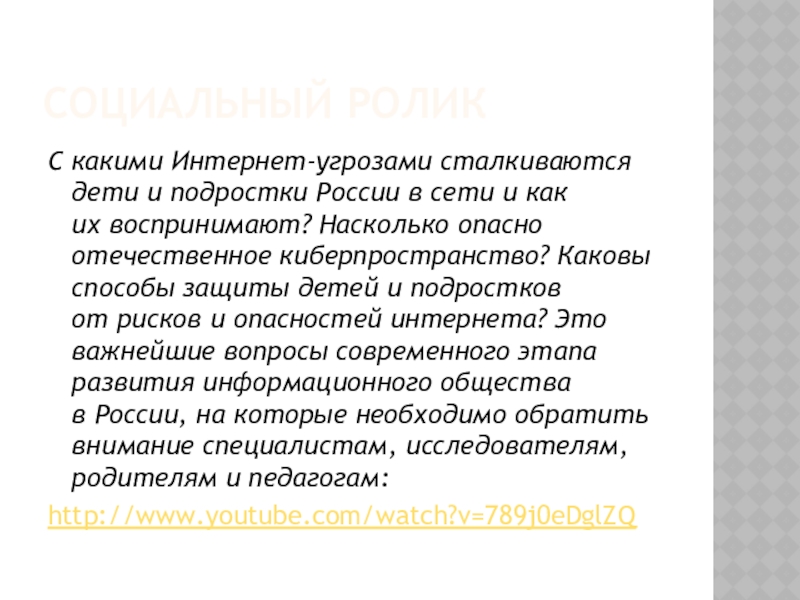 Социальный роликС какими Интернет-угрозами сталкиваются дети и подростки России в сети и как их воспринимают? Насколько опасно отечественное киберпространство? Каковы способы защиты