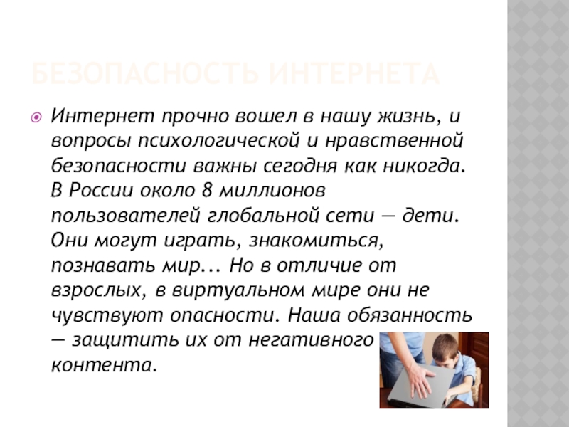 нравственной безопасности важны сегодня как никогда. В России около 8 миллионов пользователей глобальной сети — дети. Они могут играть, знакомиться, познавать мир... Но в отличие от взрослых, в виртуальном мире они не чувствуют опасности. Наша обязанность — защитить их от негативного контента.