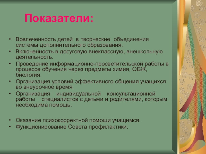 Проведение информационно-просветительской работы в процессе обучения через предметы химия, ОБЖ, биология.