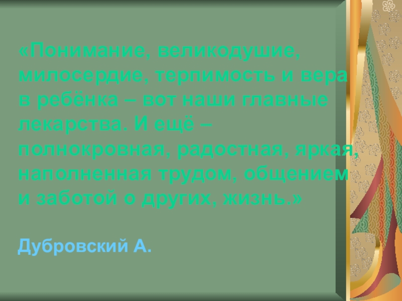 Слайд 28«Понимание, великодушие, милосердие, терпимость и вера в ребёнка – вот наши