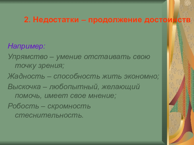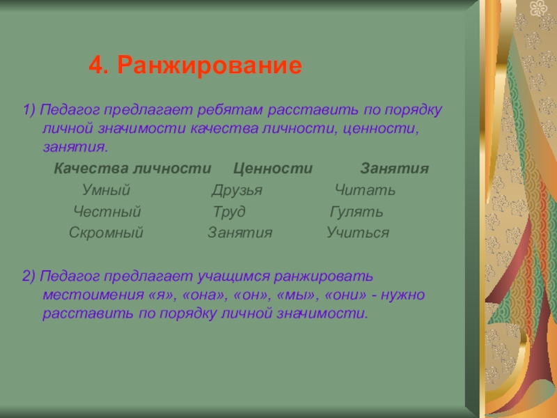 1) Педагог предлагает ребятам расставить по порядку личной значимости качества