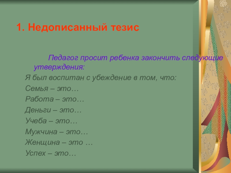 Слайд 1 «Каждому из нас при рождении дается глыба мрамора и инструменты, чтобы