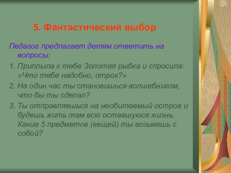 3. Ты отправляешься на необитаемый остров и будешь жить там всю оставшуюся жизнь. Какие 5 предметов (вещей) ты возьмешь с собой?
