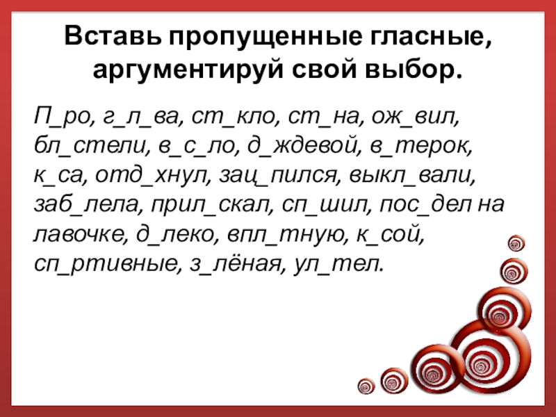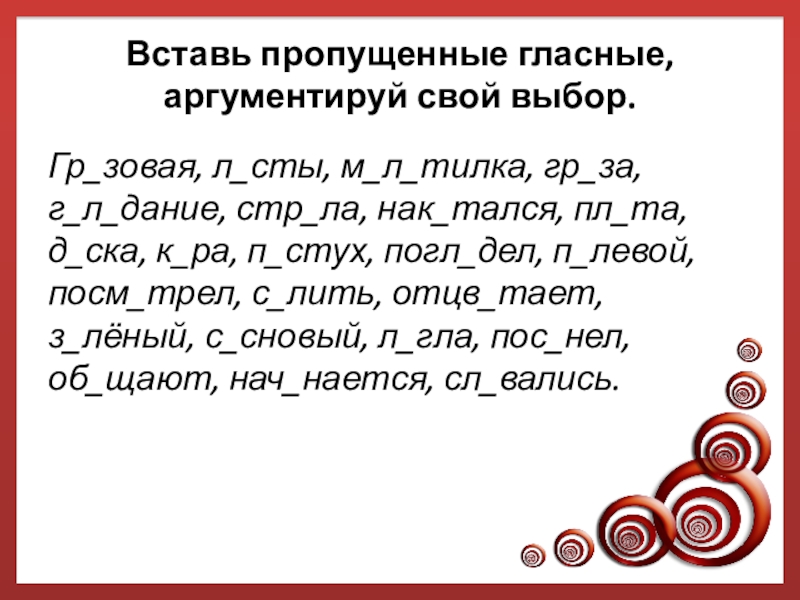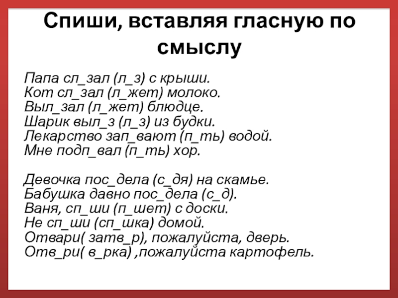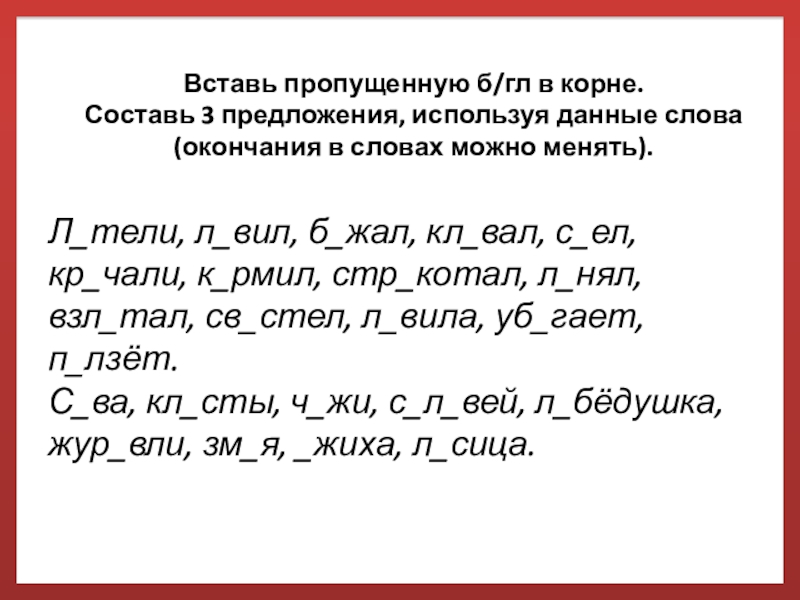 Л_тели, л_вил, б_жал, кл_вал, с_ел, кр_чали, к_рмил, стр_котал, л_нял, взл_тал, св_стел, л_вила, уб_гает, п_лзёт.