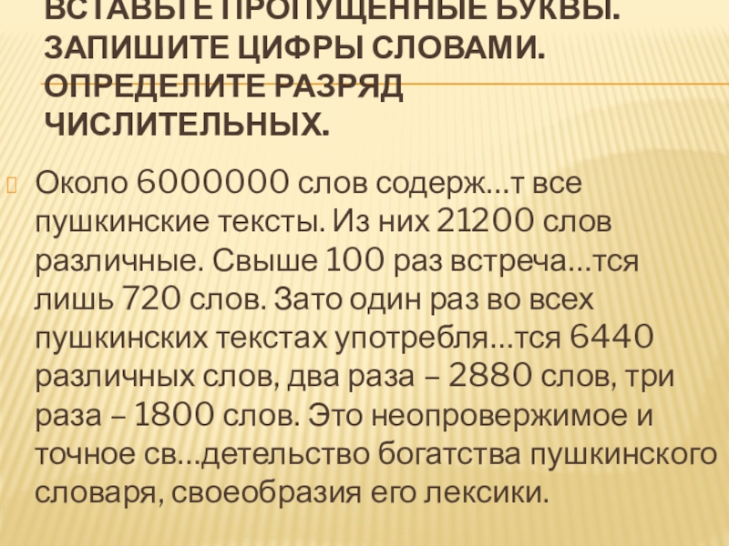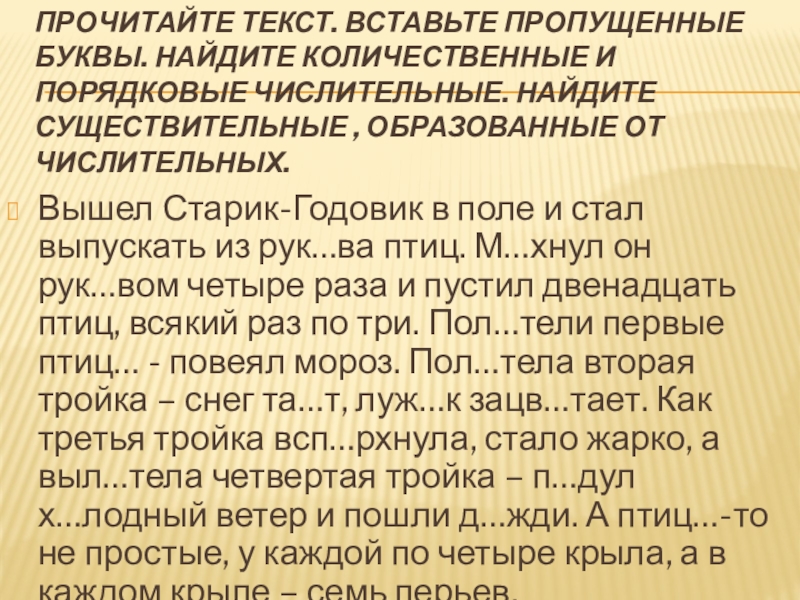 Слайд 11Прочитайте текст. Вставьте пропущенные буквы. Найдите количественные и порядковые числительные. Найдите