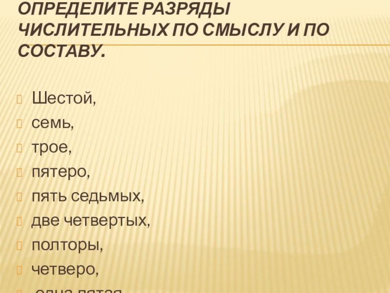 Слайд 12Определите разряды числительных по смыслу и по составу.