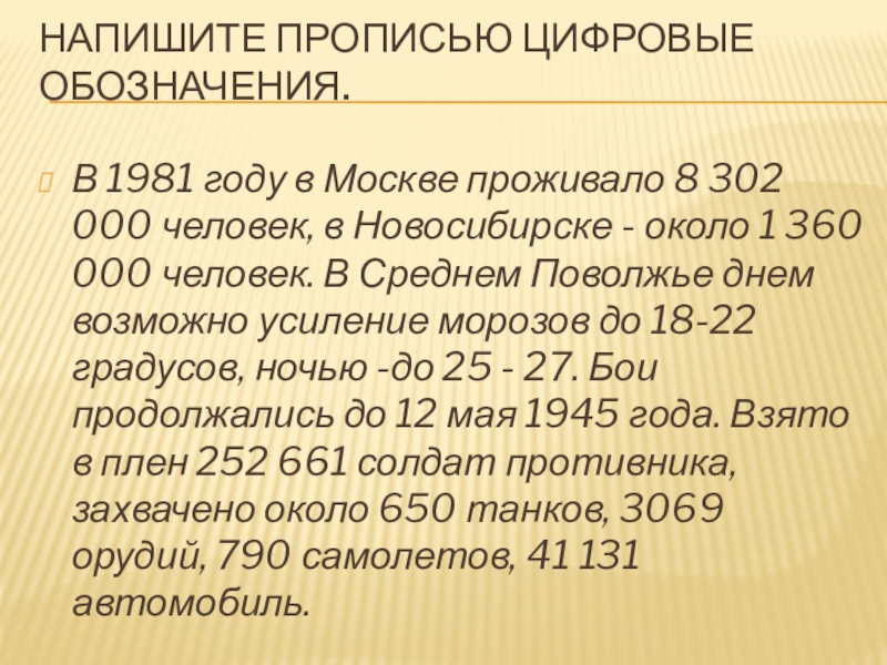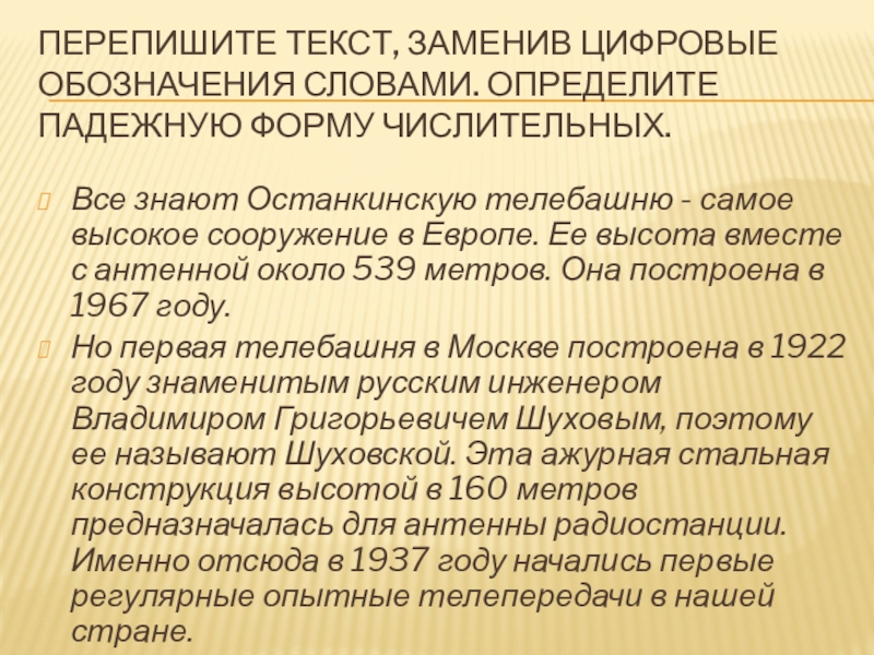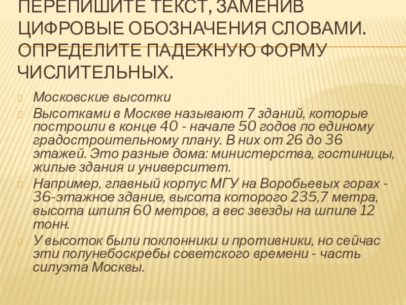 Слайд 8Перепишите текст, заменив цифровые обозначения словами. Определите падежную форму числительных.