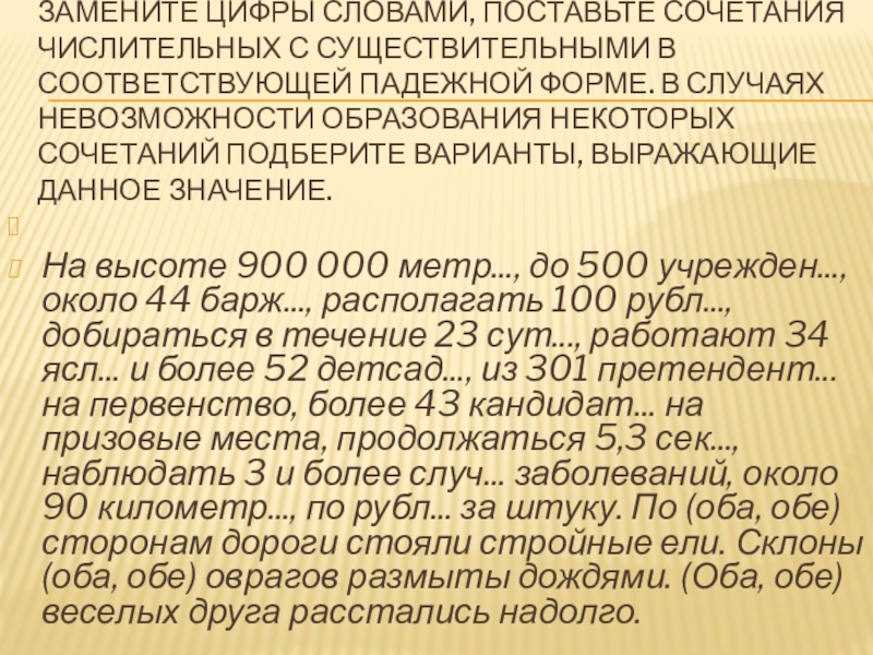 На высоте 900 000 метр..., до 500 учрежден..., около 44 барж..., располагать 100 рубл..., добираться в течение 23 сут..., работают 34 ясл... и более 52 детсад..., из 301 претендент... на первенство, более 43 кандидат... на призовые места, продолжаться 5,3 сек..., наблюдать 3 и более случ... заболеваний, около 90 километр..., по рубл... за штуку. По (оба, обе) сторонам дороги стояли стройные ели. Склоны (оба, обе) оврагов размыты дождями. (Оба, обе) веселых друга расстались надолго.