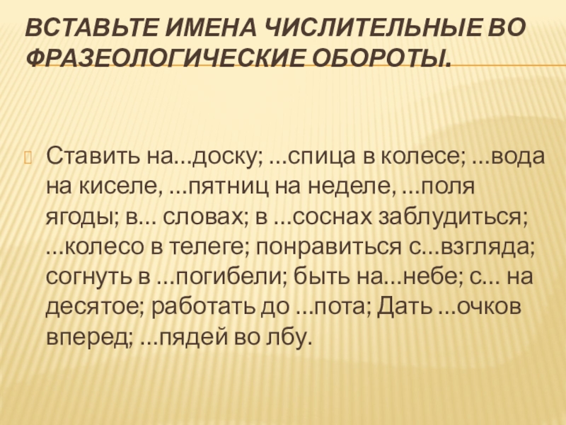 Слайд 15Вставьте имена числительные во фразеологические обороты.
