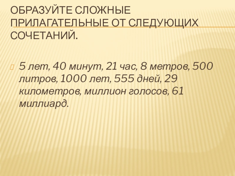 Слайд 7Образуйте сложные прилагательные от следующих сочетаний.