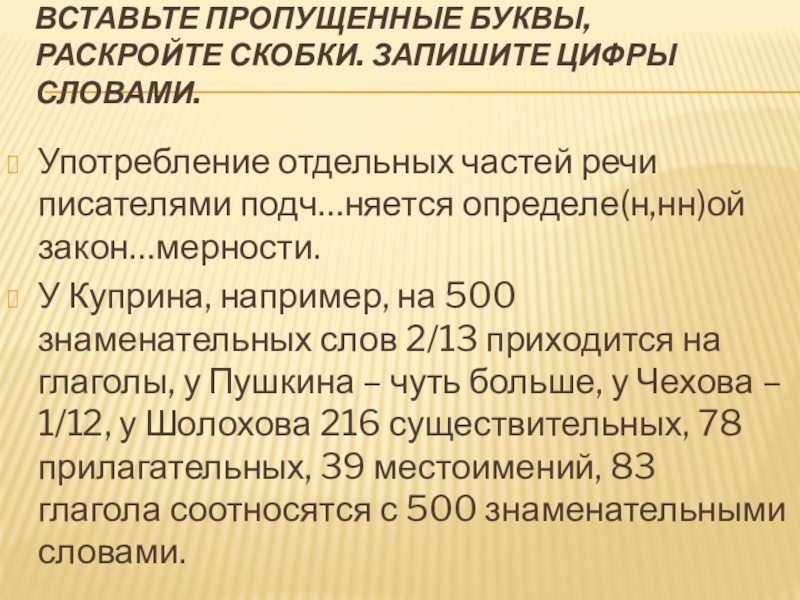 У Куприна, например, на 500 знаменательных слов 2/13 приходится на глаголы, у Пушкина – чуть больше, у Чехова – 1/12, у Шолохова 216 существительных, 78 прилагательных, 39 местоимений, 83 глагола соотносятся с 500 знаменательными словами.