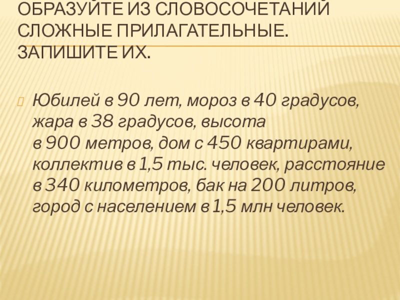 в 40 градусов, жара в 38 градусов, высота в 900 метров, дом с 450 квартирами, коллектив в 1,5 тыс. человек, расстояние в 340 километров, бак на 200 литров, город с населением в 1,5 млн человек.