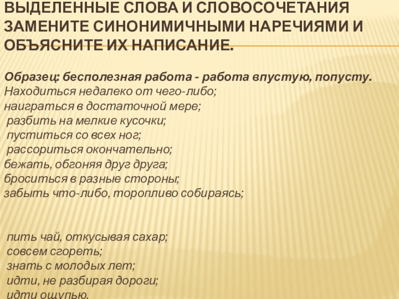 Слайд 19Выделенные слова и словосочетания замените синонимичными наречиями и объясните их написание.