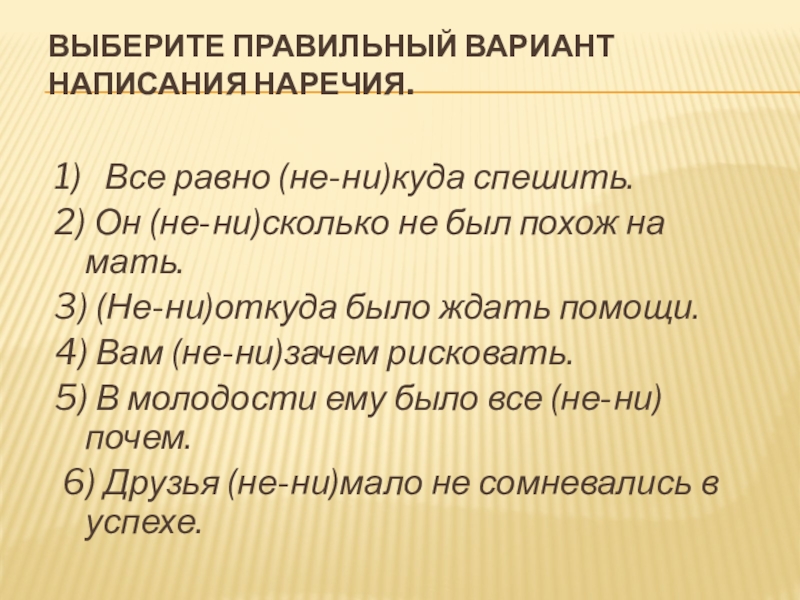6) Друзья (не-ни)мало не сомневались в успехе.