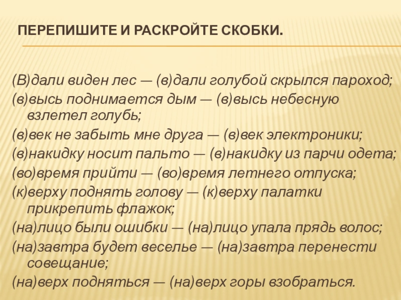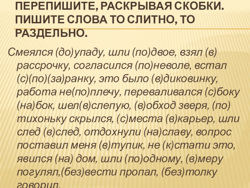 Слайд 17Перепишите, раскрывая скобки. Пишите слова то слитно, то раздельно.