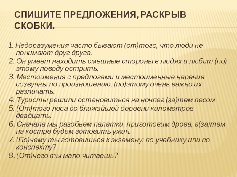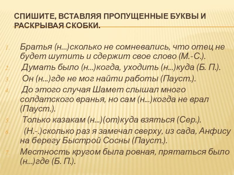 Слайд 7Спишите, вставляя пропущенные буквы и раскрывая скобки.