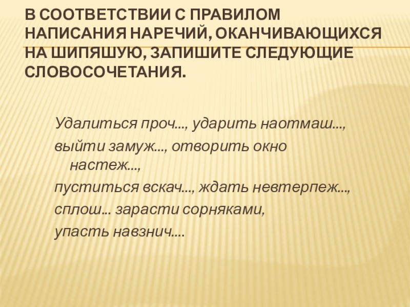 Слайд 2В соответствии с правилом написания наречий, оканчивающихся на шипяшую, запишите следующие