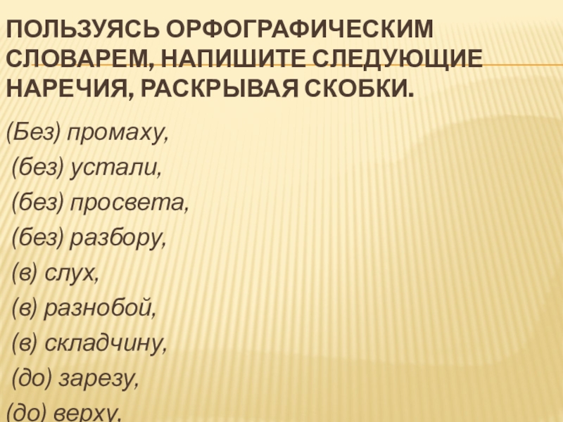 Слайд 20Пользуясь орфографическим словарем, напишите следующие наречия, раскрывая скобки.