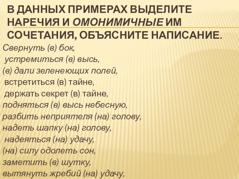 Слайд 21В данных примерах выделите наречия и омонимичные им сочетания, объясните написание.
