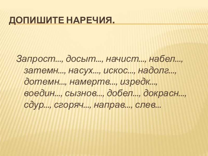 Запрост..., досыт..., начист..., набел..., затемн..., насух..., искос..., надолг..., дотемн..., намертв...,