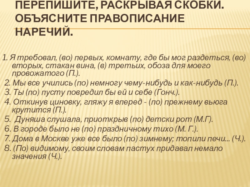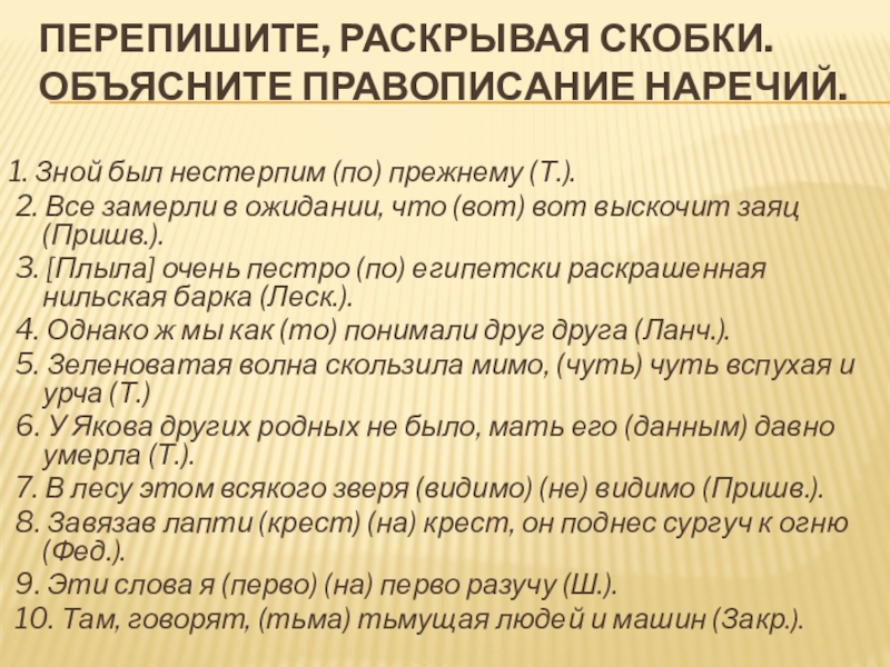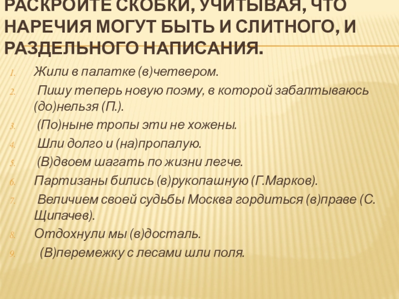 Слайд 13Перепишите, раскрывая скобки. Объясните правописание наречий.