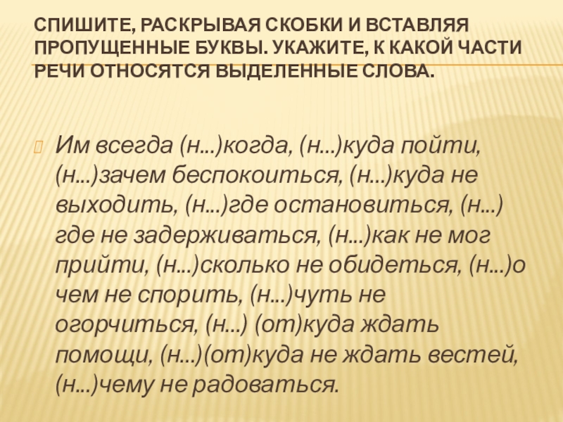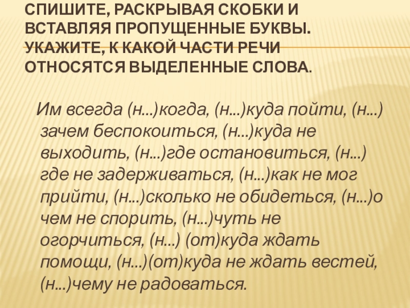 Им всегда (н...)когда, (н...)куда пойти, (н...)зачем беспокоиться, (н...)куда не выходить, (н...)где остановиться, (н...)где не задерживаться, (н...)как не мог прийти, (н...)сколько не обидеться, (н...)о чем не спорить, (н...)чуть не огорчиться, (н...) (от)куда ждать помощи, (н...)(от)куда не ждать вестей, (н...)чему не радоваться.