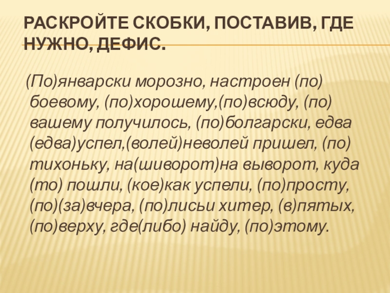Слайд 18Раскройте скобки, поставив, где нужно, дефис.