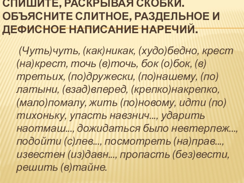 (Чуть)чуть, (как)никак, (худо)бедно, крест (на)крест, точь (в)точь, бок (о)бок, (в)третьих, (по)дружески, (по)нашему, (по)латыни, (взад)вперед, (крепко)накрепко, (мало)помалу, жить (по)новому, идти (по)тихоньку, упасть навзнич..., ударить наотмаш..., дожидаться было невтерпеж..., подойти (с)лев..., посмотреть (на)прав..., известен (из)давн..., пропасть (без)вести, решить (в)тайне.