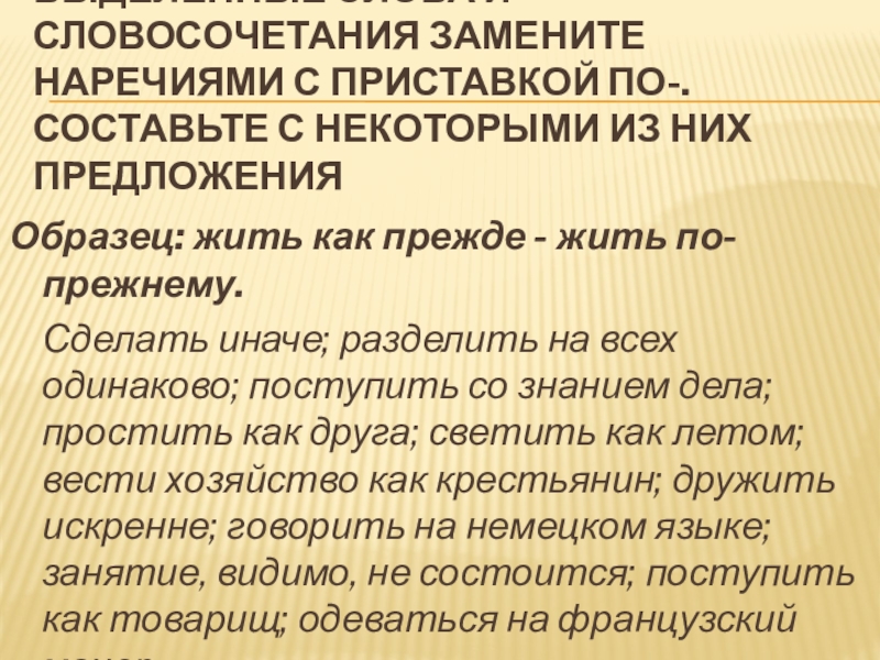 Слайд 12Выделенные слова и словосочетания замените наречиями с приставкой по-. Составьте с