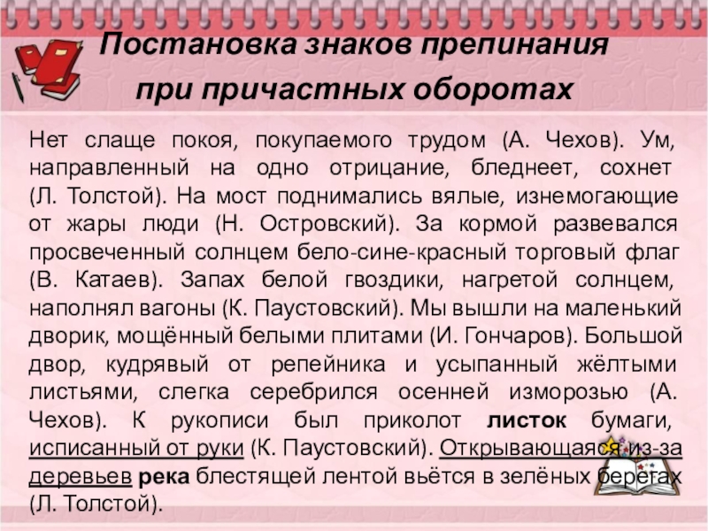 Нет слаще покоя, покупаемого трудом (А. Чехов). Ум, направленный на одно отрицание, бледнеет, сохнет (Л. Толстой). На мост поднимались вялые, изнемогающие от жары люди (Н. Островский). За кормой развевался просвеченный солнцем бело-сине-красный торговый флаг (В. Катаев). Запах белой гвоздики, нагретой солнцем, наполнял вагоны (К. Паустовский). Мы вышли на маленький дворик, мощённый белыми плитами (И. Гончаров). Большой двор, кудрявый от репейника и усыпанный жёлтыми листьями, слегка серебрился осенней изморозью (А. Чехов). К рукописи был приколот листок бумаги, исписанный от руки (К. Паустовский). Открывающаяся из-за деревьев река блестящей лентой вьётся в зелёных берегах (Л. Толстой).