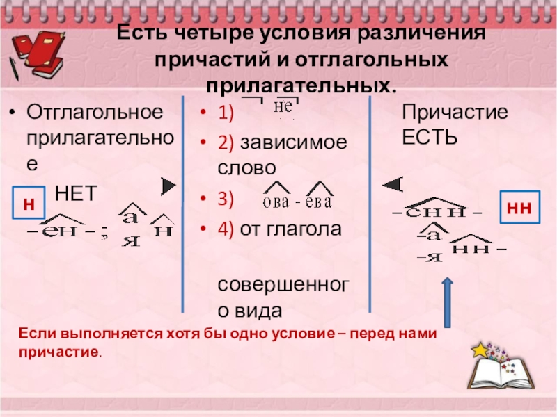 Есть четыре условия различения причастий и отглагольных прилагательных.