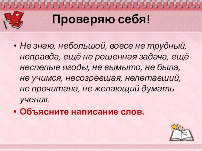 задача, ещё неспелые ягоды, не вымыто, не была, не учимся, несозревшая, нелетавший, не прочитана, не желающий думать ученик.