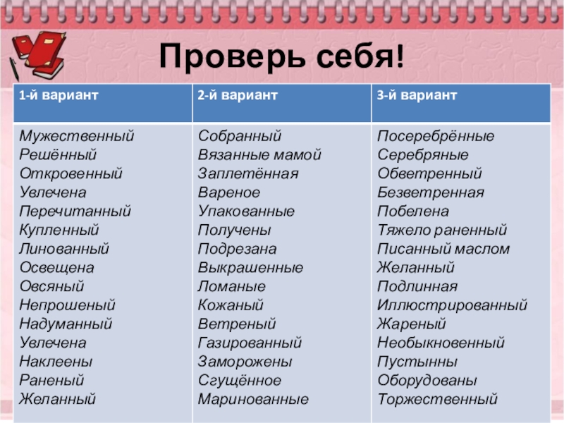 желанный, священный, деревянный, смышлёный, раненный в руку, маринованный, масляное пятно, масленый блин, ветряной двигатель.