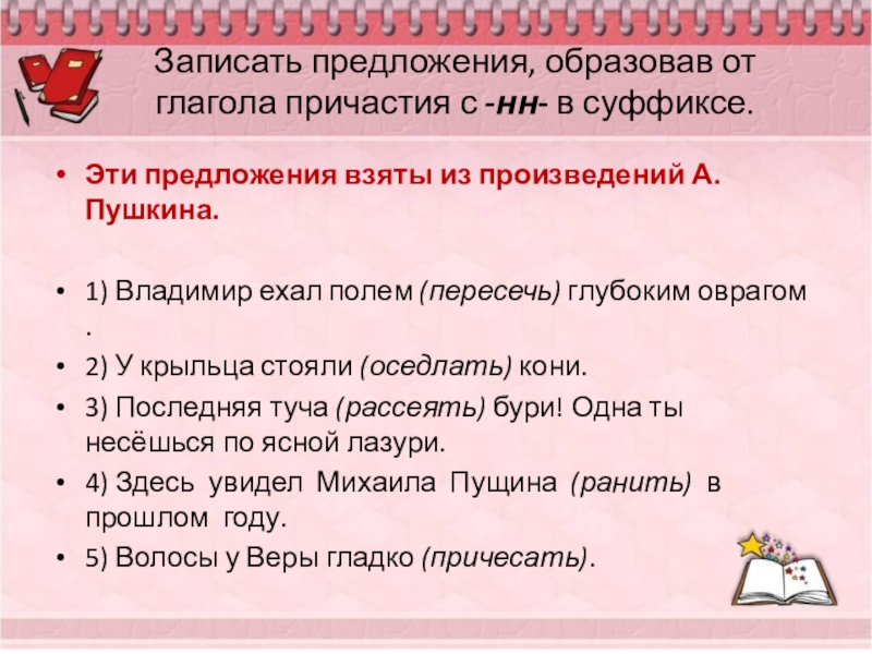 4) Приведите примеры причастий. Охарактеризуйте признаки прилагательного и глагола.