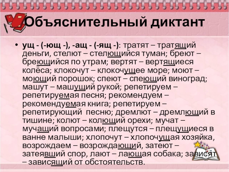 тратящий деньги, стелют – стелющийся туман; бреют – бреющийся по утрам; вертят – вертящиеся колёса; клокочут – клокочущее море; моют – моющий порошок; спеют – спеющий виноград; машут – машущий рукой; репетируем – репетируемая песня; рекомендуем – рекомендуемая книга; репетируем – репетирующий песню; дремлют – дремлющий в тишине; колют – колющий орехи; мучат – мучащий вопросами; плещутся – плещущиеся в ванне малыши; хлопочут – хлопочущая хозяйка, возрождаем – возрождающий, затеют – затеявший спор, лают – лающая собака; зависят – зависящий от обстоятельств.
