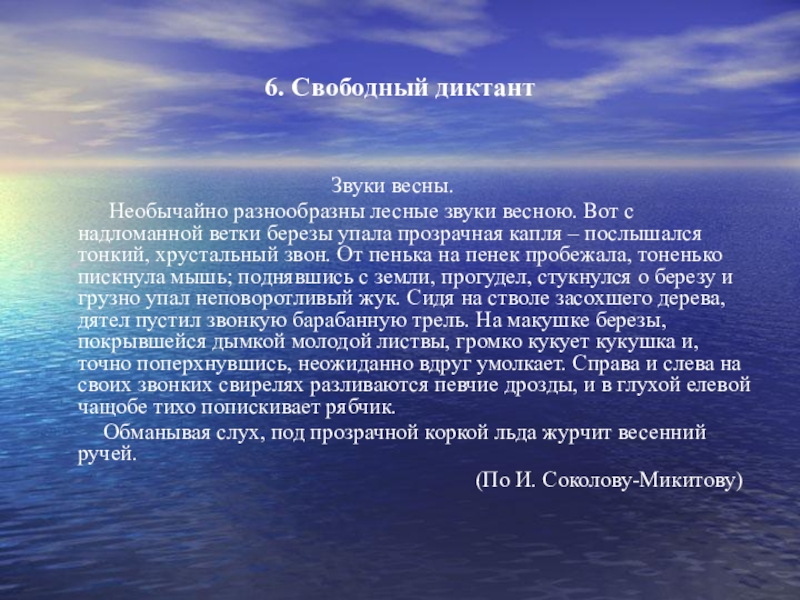 Над прозрачными еще вершинами осин ярко с..неют м..лодые весе..ие неб..са с бегущими под ними белыми облаками.