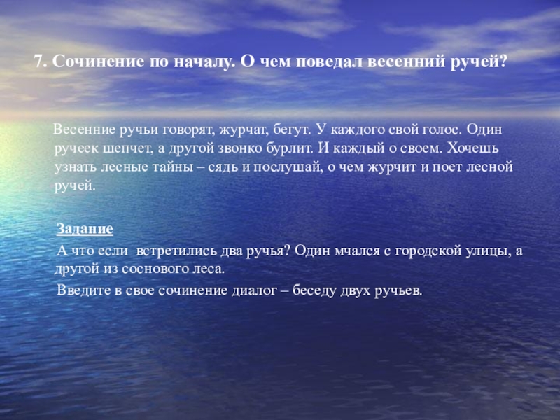 Слайд 127. Сочинение по началу. О чем поведал весенний ручей?