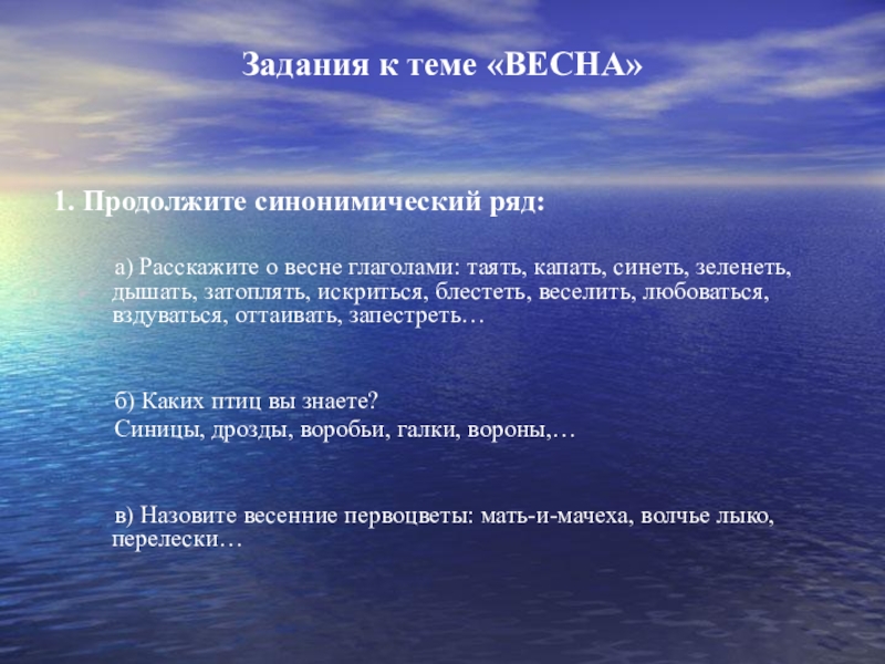 а) Расскажите о весне глаголами: таять, капать, синеть, зеленеть, дышать, затоплять, искриться, блестеть, веселить, любоваться, вздуваться, оттаивать, запестреть…