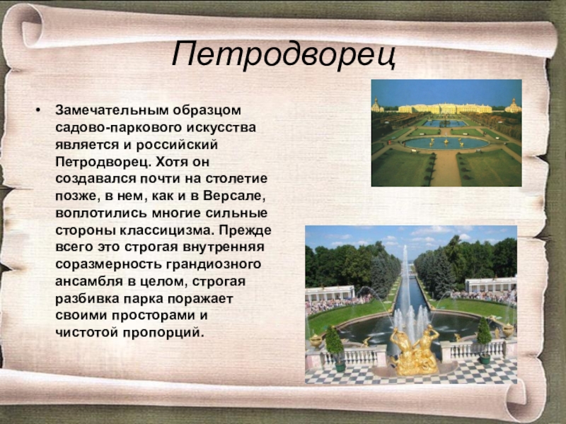 Замечательным образцом садово-паркового искусства является и российский Петродворец. Хотя он создавался