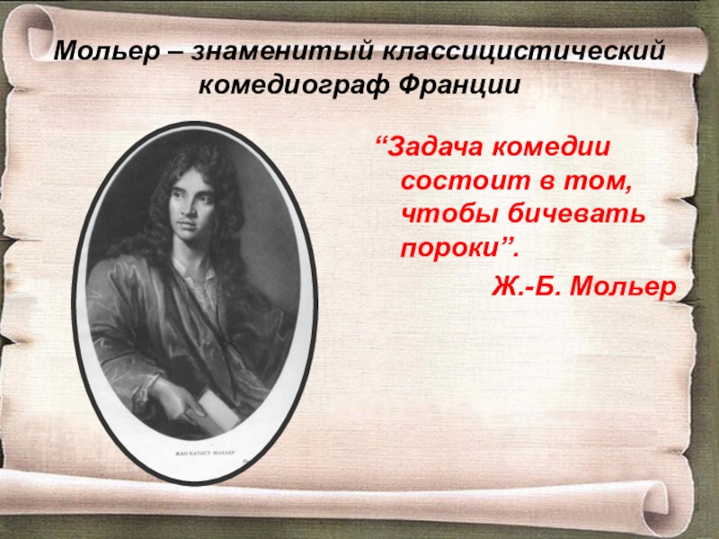 Слайд 31Мольер – знаменитый классицистический комедиограф Франции