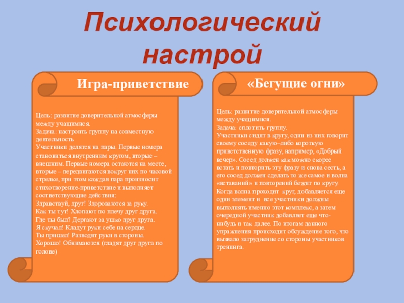 Участники сидят в кругу, один из них говорит своему соседу какую–либо короткую приветственную фразу, например, «Добрый вечер». Сосед должен как можно скорее встать и повторить эту фразу и снова сесть, а его сосед должен сделать то же самое и волна «вставаний» и повторений бежит по кругу. Когда волна проходит круг, добавляется еще один элемент и все участники должны выполнять именно этот комплекс, а затем очередной участник добавляет еще что-нибудь и так далее. По итогам данного упражнения происходит обсуждение того, что вызвало затруднение со стороны участников тренинга.