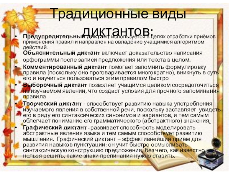 Традиционные виды диктантов: Предупредительный диктант используется в целях отработки приёмов применения правил и направлен на овладение учащимися